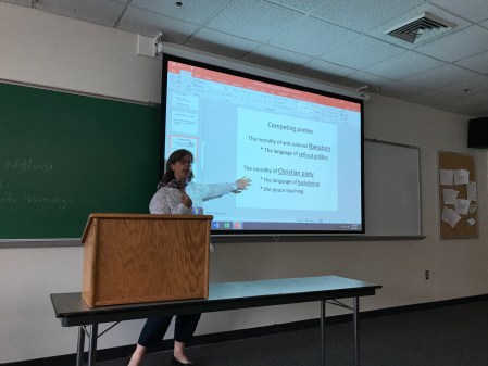 Lucille Marr delivers her paper on H. Frances Davidson, an early Brethren in Christ missionary. Marr’s current project explores Davidson’s early life through a close reading of her journals. An understudied resource!Wendy Urban-Mead delivers part of her amazing (no notes, yet tightly focused!) paper on Brethren in Christ in Zimbabwe during that nation’s civil war. How, she asks, did a peace church navigate the complexities of piety, race, gender, and political violence?What a privilege to speak on a panel with these amazing scholars! I’m in awe of you both.Such fun to talk history, Anabaptism, teaching, grad school, and more with these fellow scholars and contributors to the Anabaptist Historians blog. From left to right: Ben Goossen, Christina Entz Moss, Joel Horst Nofziger, Simone Horst, me, and Anna ShowalterThe natural beauty of the Shenandoah Valley, from the hill behind the Eastern Mennonite University campus